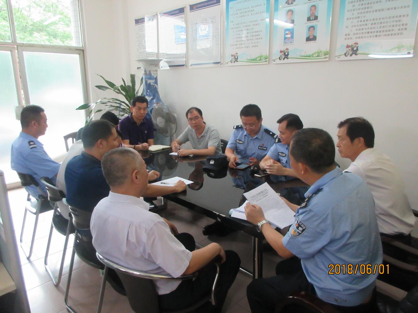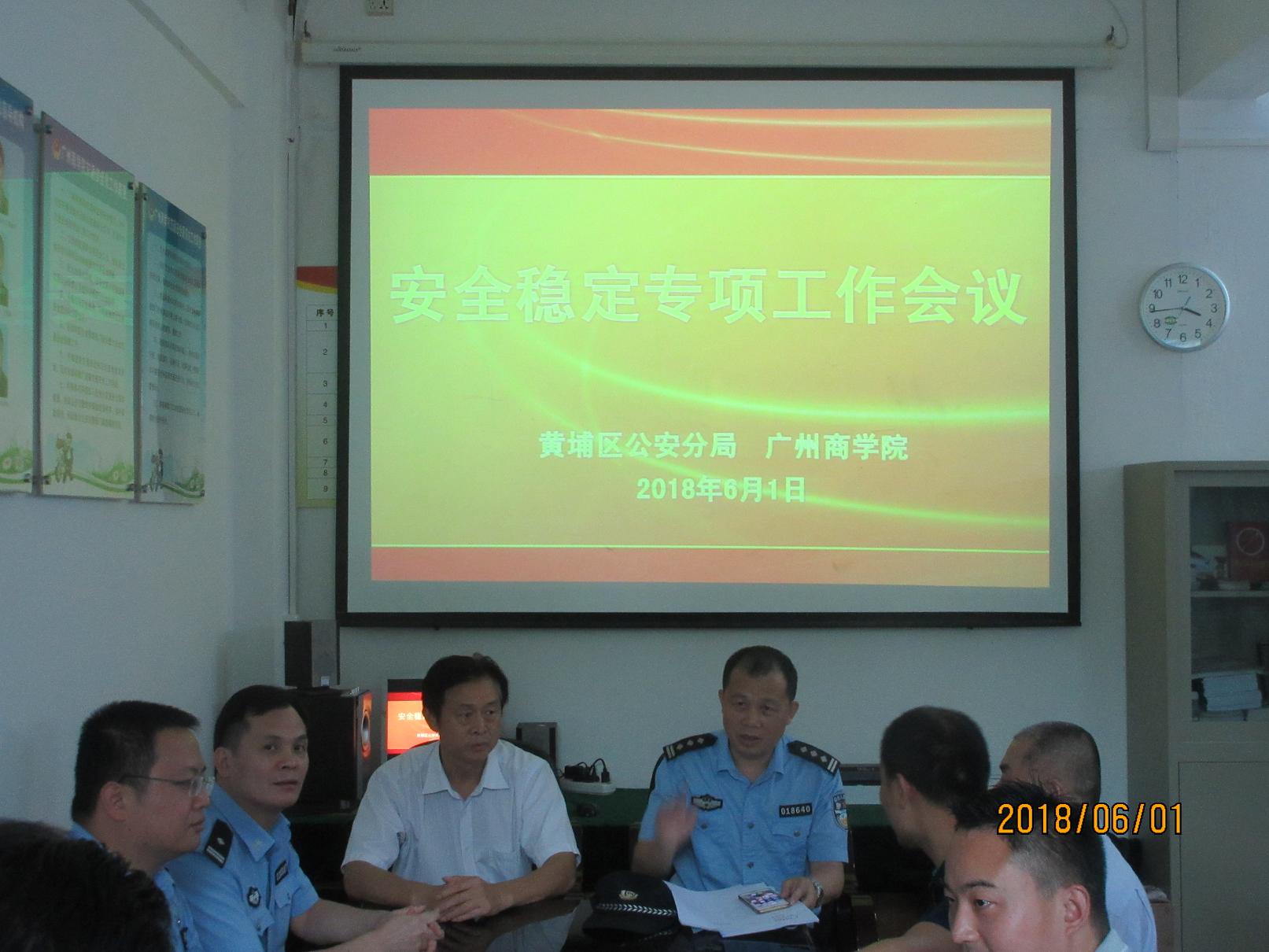 2018年6月1日下午,黄埔区公安分局安全稳定专项工作检查组警官来我校检查指导安全管理工作并召开安全稳定专项工作会议,学校党委书记吕泉荣、工会主席刘炳荣出席会议,镇龙派出所社区负责民警、保卫处、学生处、后勤等部门相关负责人参加会议。